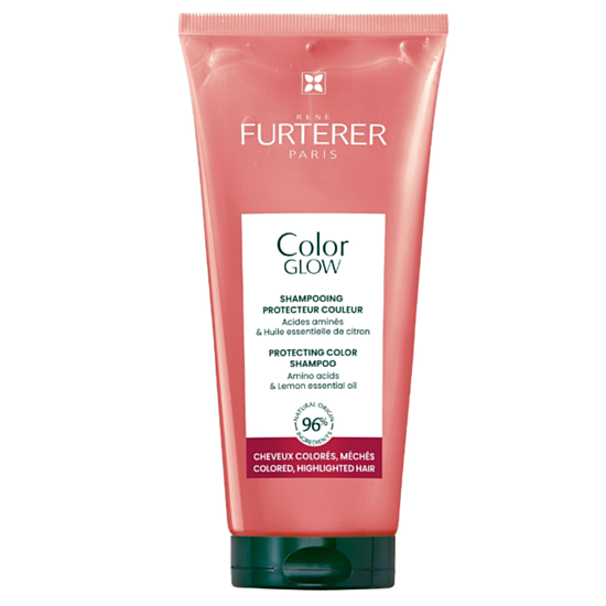 РЕНЕ ФЮРТЕРЕР COLOR GLOW ШАМПОАН ЗА ЗАЩИТА НА ЦВЕТА 200МЛ е шампоан за защита на цвета без сулфати, който нежно почиства боядисаната коса или косата на кичури, като запазва цвета при всяко измиване. Обогатен с 96% натурални съставки, той премахва варовика и замърсяванията, затваря люспите на косата и предотвратява избледняването на цвета до 10 седмици*. Перфектно почистена, косата е подсилена и по-мека. Цветът е интензивен и дълготраен. Биоразградима формула. Без сулфатирани сърфактанти. Не съдържа силикон. Подходящ е за боядисана, светлокестенява, тъмна и червено-кестенява коса.