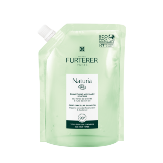 Нежен мицеларен шампоан за честа употреба, Пълнител 400 мл., Rene Furterer Naturia е подходящ за честа употреба при всеки тип коса на възрастни и деца над 3 годишна възраст. Специалната формула на Rene Furterer Naturia Gentle Micellar Shampoo съдържа флорална вода от органична Лавандула и ценно органично Рициново масло. 98% съставки с натурален произход.