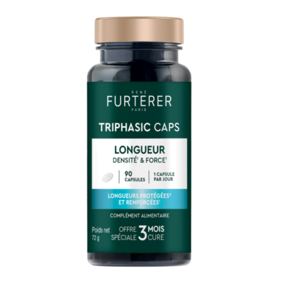Triphasic Caps хранителна добавка за стимулиране растежа на косата е специално създадена за дълга коса. Нейната формула, богата на витамини, добавя плътност* и възстановява красотата на дългата коса*. Дължините са укрепени* и защитени благодарение на витамин Е, който помага за защита на клетките срещу оксидативен стрес. Капсула без изкуствени оцветители.