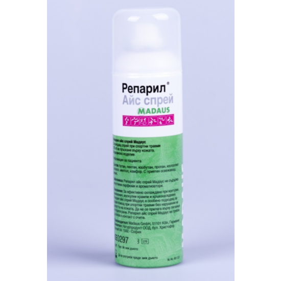 Репарил Айс-Спрей е обезболяващ спрей с охлаждащо действие при контузии, навяхвания, мускулни крампи и кръвонасядания. Не губи охлаждащия си ефект дори и при високи температури на околната среда. Предотвратява разпространението на подкожни кръвоизливи и появата на синини. Има приятен свеж мирис и се понася добре от кожата. Удобен е за носене и е подходящ както при дълги преходи, така и при спорт на открито и закрито. Не заема повече място от един дезодорант. Проблеми: хематоми, спортни травми.