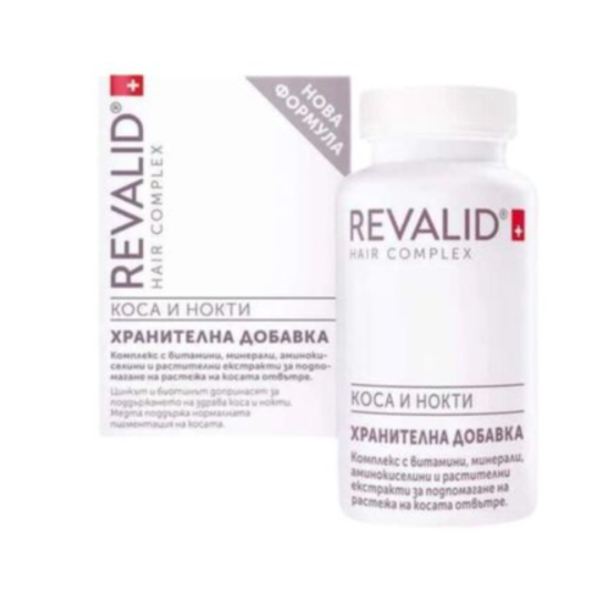 Revalid за коса и нокти на чешката компания Евофарма е комплекс с витамини, минерали, аминокиселини и растителни екстракти за подпомагане на растежа на косата отвътре. Цинкът и биотинът допринасят за поддържането на здрава коса и нокти, а медта спомага за поддържането на нормалната пигментация на косата. Продуктът подпомага растежа на косата, предпазва клетките от оксидативен стрес, предпазва косата от стареене чрез защита от негативните фактори на околната среда, предотвратява посивяването, поддържа здравето на скалпа и подпомага регенерацията на косата и скалпа. Без глутен.
