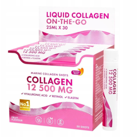Collagen 12 500 mg е хранителна добавка, съчетаваща колаген с ретинол, еластин и антиоксиданти. Комбинацията е насочена към поддържане на стегната, сияйна и ревитализирана кожа. Спомага за косата и ноктите, носи ползи за ставите. Благодарение на комбинацията от висока доза морски колаген, антиоксиданти, ретинол, хиалуронова киселина и еластин, тази добавка действа комплексно отвътре-навън. Формулата има свойството да подпомага хидратацията, води до запълване на фини линии и бръчки и изравнява тена. Регенерира и притежава съставки с антиоксидантни свойства. Рибен колаген 12 500 мг с хиалурон, ретинол и еластин се предлага в удобни сашета – идеални за пътуване или тренировка, в течна форма за лесно усвояване, без нужда от вода, без добавена захар, с естествени аромати и оцветители.