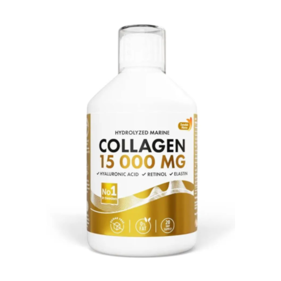Collagen 15 000 mg е течна формула, съчетаваща колаген с ретинол, еластин и антиоксиданти. Комбинацията е насочена към поддържане на стегната, сияйна и ревитализирана кожа. Спомага за косата и ноктите, носи ползи на ставите. Благодарение на комбинацията от висока доза морски колаген, антиоксиданти, ретинол, хиалуронова киселина и еластин, тази добавка действа комплексно отвътре-навън. Формулата има свойството да подпомага хидратацията, води до запълване на фини линии и бръчки, изравнява тена. Регенерира и притежава съставки с антиоксидантни свойства. Течен рибен колаген 15 000 мг с хиалурон, ретинол и еластин е лесен за усвояване, с плодов вкус, без добавена захар.