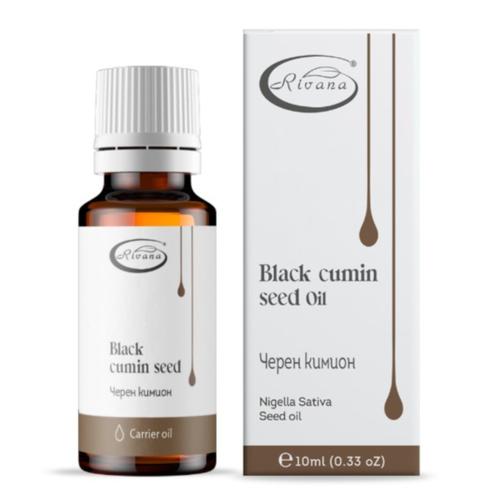 РИВАНА ЕТЕР.МАСЛО ЧЕРЕН КИМИОН 10МЛ - Подходящо е за всякакъв тип кожа, особено за суха, дехидратирана, чувствителна, зряла, груба или раздразнена. Спомага за намаляване на бръчките, овлажнява, подхранва и забавя процесите на стареене на кожата. Повишава еластичността на бюста. Не оставя мазни следи. Помага за заздравяване на ноктите и ги предпазва от чупене. Маслото от черен кимион подобрява растежа на косата, предпазва от преждевременно побеляване, намалява косопада. За блестяща и здрава коса.