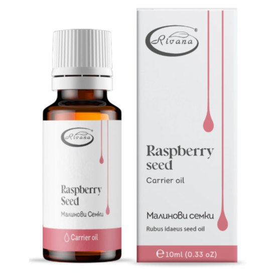 РИВАНА ЕТЕР.МАСЛО МАЛИНОВИ СЕМКИ 10МЛ - Маслото от малинови семки е с високо съдържание на витамин А и Е, Омега-3 и 6 есенциални мастни киселини. Маслото действа благоприятно при проблемна кожа склонна да образува акне, не запушва порите, абсорбира се много бързо и кожата остава гладка и мека. Може да помогне за успокояване на сърбеж при люспеща и раздразнена кожа. Предпазва кожата от общите признаци на стареене, ефективно хидратира, омекотява и подобрява еластичността на кожата, намалява видимо бръчките, стяга отпуснатата кожа.