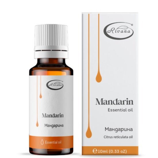 РИВАНА ЕТЕР.МАСЛО МАНДАРИНА 10МЛ - Премахва целулита, стрии и белези по кожата, повишена еластичност, при акне, гъбички, мазна и раздразнена кожа. Намалява прекомерното изпотяване. Укрепва косата, премахва пърхота, при кървене на венците, лош дъх в устата, подпомага кръвообращението, повишава имунната система, подпомага храносмилането, възбужда апетита, пречиства организма от токсини, възпрепятства натрупването на излишни килограми. Еротичен стимулатор. Освежава, дезодорира и дезинфекцира въздуха. Подобрява настроението, облекчава депресията, насърчава безпокойството и страха, предизвиква чувства на радост, щастие и оптимизъм. Успокоява ума, увеличава концентрацията, приспивателно действието. Премахва хипервъзбудимост, ревливост и истерични реакции при деца. Идеален за детска стая.