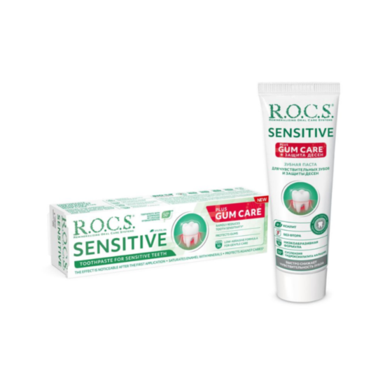 РОКС ПАСТА ЗА ЗЪБИ SENSITIVE PLUS GUM CARE 75МЛ. е паста за зъби предназначена за ежедневна орална хигиена на хора, страдащи от повишена чувствителност на зъбите и венците. Уникалната формула с нискоабразивни частици деликатно и ефективно премахва плаката, укрепва емайла, насищайки го с основни минерали, облекчава симптомите на чувствителност на зъбите и значително подобрява състоянието на венците и устната лигавица. Ефектът се забелязва след първото приложение. Различните по големина частици хидроксиапатит, които имат висок афинитет към зъбните тъкани, осигуряват бързо намаляване на чувствителността чрез запечатване на най-малките дефекти в емайла и тубулите на открития дентин.