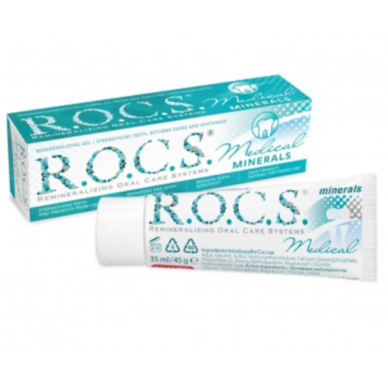 РОКС РЕМИНАЛИЗИРАЩ ГЕЛ МЕДИКАЛ МИНЕРАЛС 40ГР. е реминерализиращ гел против поява на кариеси и други увреждания по зъбите. Съдържа източници на калций, фосфат, магнезий и е идеален против поява на кариеси. Спомага за подобряване на външния вид на зъбите. Подходящ е преди и след ортодонтско лечение, може да се нанася с мека четка за зъби.