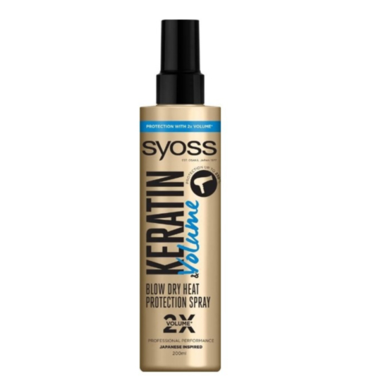 САЙЪС СПРЕЙ ТОПЛИННА ЗАЩИТА ОБЕМ 200МЛ е спрей за коса, който осигурява ефективна топлинна защита при оформяне на косата с преси, маши и сешоари. Предпазва косъма от увреждане, дори при много висока температура - до 230°C. Придава на косата до 2 пъти повече обем. Формулата съдържа кератин, който укрепва и възстановява структурата на косъма, подсилва естествения му блясък и красота. Благодарение на него, косата остава защитена при честото сушене, къдрене или изправяне. Вложени са още пантенол и ниацинамид (витамин B3), които хидратират и укрепват косъма. Термозащитния спрей Syoss намалява наелектризирането, помага за оформяне на косата и улеснява разресването ѝ.