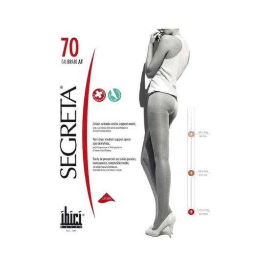 Стягащ и оформящ чорапогащник, който е специално разработен за жени с наднормено тегло, притежава средна компресия (от 11 до 14 mmHg) и облекчава умората. Медицински тестваната технология нежно стимулира кръвообращението и възпрепиятства появата на отоци и разширени вени. Същевременно осигурява на тялото продължителен микромасаж, който спомага за намаляване на опасността от кръвозадържане в глезените. Продуктът разполага с удобна двойна платка в задната част и "анатомична пета", която допринася за максимален комфорт по време на приложение. Страхотният чорапогащник от Segreta поддържа точната степен на компресия и гарантира ефективността си на терапевтично действие дори и след многократно изпиране.