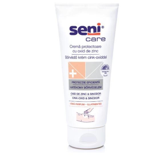 СЕНИ КРЕМ ЗА ТЯЛО С ЦИНКОВ ОКСИД ЗА РАЗДРАЗНЕНА КОЖА И ПРИ РАНИ 100МЛ представлява крем за защита на кожата, подложенa на риск от продължително залежаване, ожулвания и действието на дразнещи вещества. Сени Кеър Крем за тяло с цинков оксид се препоръчва за хора, които използват пелени. Благодарение на активните си съставки, кремът предпазва от поява на възпаления, ожулвания, обриви и рани от залежаване. Кремът съдържа цинков оксид, който има антибактериално и антисептично действие и предпазва кожата от раздразнения. След нанасяне, кремът оставя бял защитен слой върху кожата. Предлага се в опаковка от 100 мл.