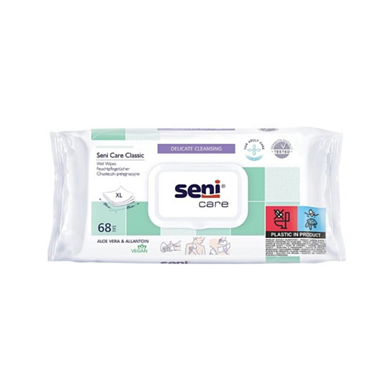 СЕНИ МОКРИ КЪРПИ С АЛАНТОИН И АЛОЕ ВЕРА ЗА ОВЛАЖНЯВАЩ И ОМЕКОТЯВАЩ ЕФЕКТ Х 68БР. представляват мокри кърпи, които почистват и освежават тялото. Те са направени от мек и плътен нетъкан текстил – благодарение на специалната си структура перфектно, ефективно и деликатно почистват кожата, отстраняват замърсяванията и освежават кожата без да я дразнят. Съдържат благоприятно за кожата pH 5,5. Дерматологично тествани. Не съдържат парабени, парфюм и алкохол. Предлагат се в удобна опаковка х 68 бр. със затварящ се капак, който предотвратява изсъхването на кърпите.