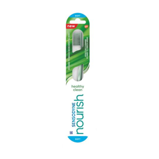 Sensodyne Nourish Healthy Clean представлява четка за зъби, чиято дръжка е направена от естествен вторичен продукт от хартиената промишленост, а косъмчетата са направени от рециклирана пластмаса*. Четка за зъби е с плътно разположени, меки и заоблени влакна, предназначена за нежно, но ефективно почистване, дори и на труднодостъпните места. Рециклируема опаковка, не съдържа пластмаса.
