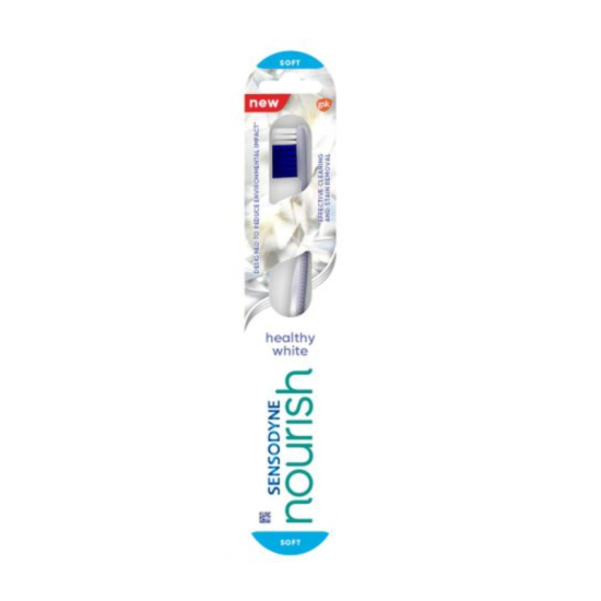 Sensodyne Nourish Healthy White представлява четка за зъби, чиято дръжка е направена от естествен вторичен продукт от хартиената промишленост, а косъмчетата са направени от рециклирана пластмаса*. Четка за зъби е с плътно разположени, меки и заоблени влакна, предназначена за нежно, но ефективно почистване и премахване на петна. Рециклируема опаковка, не съдържа пластмаса.