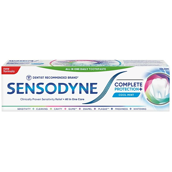 СЕНСОДИН ПАСТА ЗА ЗЪБИ COMPLETE PROTECTION + 75МЛ - Пастата за зъби от Sensodyne Complete Protection поддържа здрави венците, укрепва и втвърдява емайла, предотвратява оцветяването на зъбите и избелва емайла, осигурява дълготрайна защита и бързо облекчение. Подходяща е за чувствителни зъби. Клинично доказано облекчава болката и предоставя ежедневна защита при чувствителни зъби. Формулата с калаен флуорид възстановява защитния слой върху зъбите, за да предпази от чувствителност.
