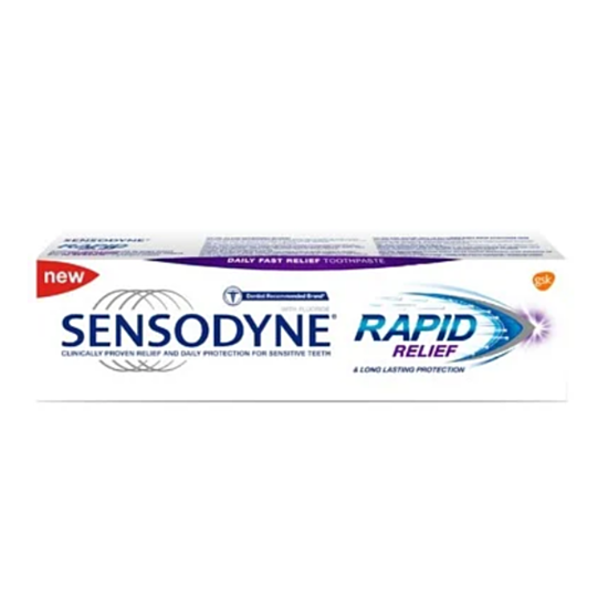 СЕНСОДИН ПАСТА ЗА ЗЪБИ RAPID RELIEF 75МЛ е паста предназначена за защита и успокояване на чувствителни зъби. Зъбите стават чувствителни, когато дентина, който се намира по зъбният емайл се оголи. При контакт на зъба със студено, горещо, сладко, кисело или дори четкане на зъбите, може да се усети кратка и остра болка. Облекчава болката и чувствителността. Предлага се в опаковка от 75 мл.