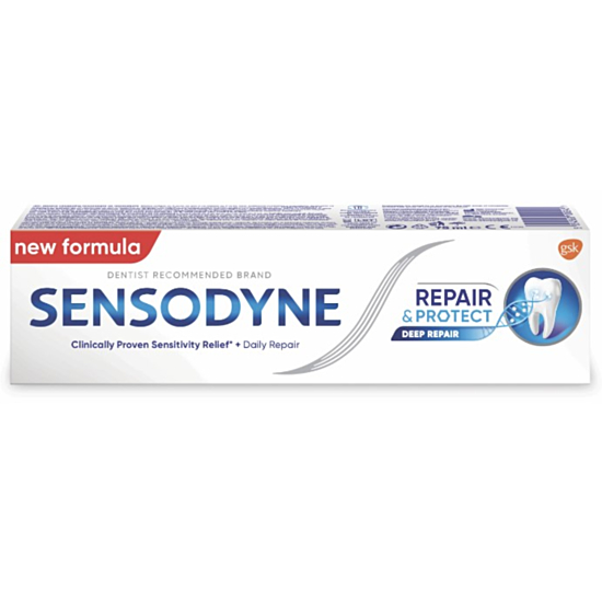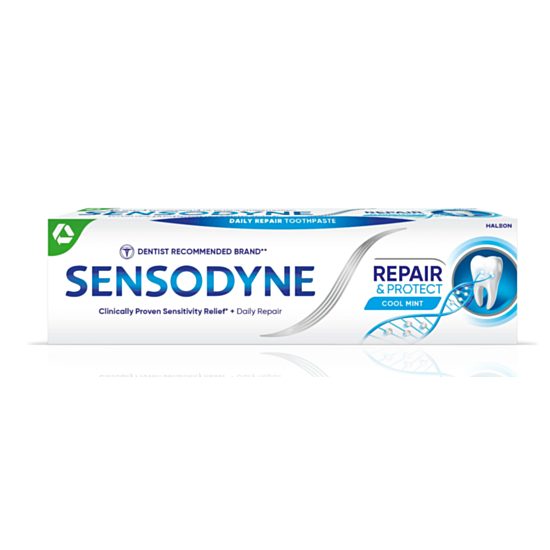 СЕНСОДИН ПАСТА ЗА ЗЪБИ REPAIR&PROTECT 75МЛ е паста предназначена за чувствителни зъби. Спомага за възстановяване на чувствителните зони, изграждайки естествена защитна бариера. Зъбите стават чувствителни, когато дентина, който се намира по зъбният емайл се оголи. При контакт на зъба със студено, горещо, сладко, кисело или дори четкане на зъбите, може да се усети кратка и остра болка. Формулата с активни съставки Novamin и предизвиква освобождаване на градивните елементи на зъба: калций и фосфат. Тези йони формират защитен слой и възстановяват увредените зони. Предлага се в опаковка от 75 мл.