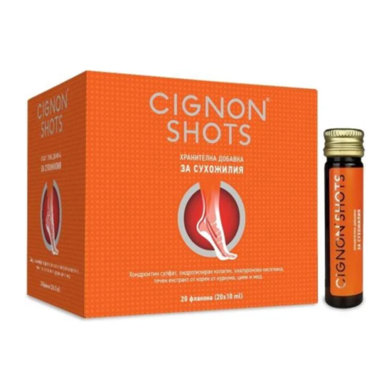 СИГНОН ШОТС осигурява комбинация от хондроитин сулфат, хидролизиран колаген, хиалуронова киселина, цинк, мед и екстракт от куркума. Добавката е създадена специално за поддържане на нормалното състояние на сухожилията. Освен това подпомага синтеза на протеини в меките тъкани. Медта спомага за поддържане на нормално състояние на съединителната тъкан. Цинкът помага за правилния синтез на протеини и участва в процеса на делене на клетките. Цинкът и медта предпазват клетките от оксидативен стрес.