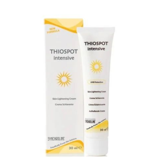 СИНХРОЛАЙН ТИОСПОТ ИНТЕНЗИВ КРЕМ ПРИ ХИПЕРПИГМЕНТАЦИЯ 30МЛ представлява високоефективен крем, разработен за третиране на локализирани и дифузни хиперпигментации по тялото и лицето. Синхролайн Интензивен крем за лице и тяло за третиране на пигментни петна ефективно повлиява на синтеза на меланин и ускорява регенерацията на кожата. Слънцезащитният филтър за UVB лъчите предпазва от ново образуване на пигментни петна. Абсорбира се бързо и не оставя лепкави и мазни следи. Предлага се в опаковка от 30 мл.