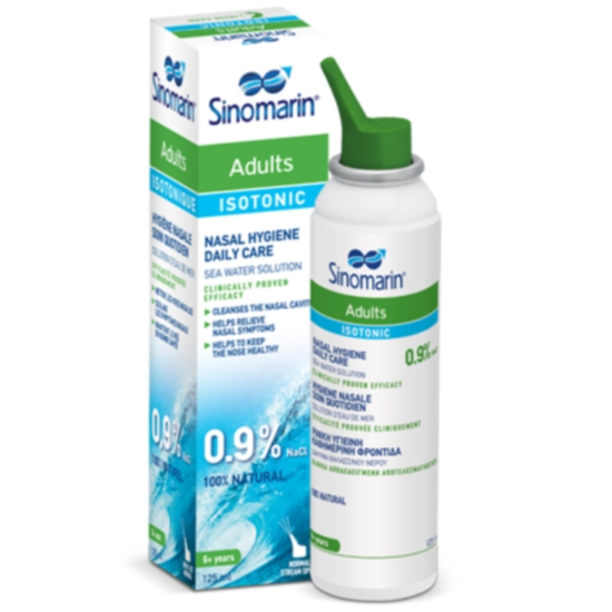 Sinomarin Adults Isotonic Nasal Hygiene Daily Care е 100% натурален, клинично доказан назален деконгестант. Изотоничен разтвор на морска вода (0,9% NaCl), естествено богат на морски минерални соли и микроелементи. Почиства носните кухини чрез отмиване на натрупания секрет и примесите в него като патогени, алергени и други замърсители. Помага за поддържането на носа здрав и предотвратяването на вторични УНГ инфекции. Помага за облекчаване на симптоми като запушване и хрема, причинени от например обикновена настинка или алергии и спомага за подобряване на дишането през носа, както и за овлажняване на носната лигавица при сухи условия.