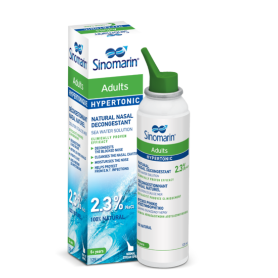 100% натурален и клинично доказан назален деконгестант. Това е хипертоничен разтвор с морска вода (2.3% NaCl), богат на полезните съставки на морето (минерални соли и микроелементи). Продуктът облекчава запушването на носа и синусовото налягане чрез естествения процес осмоза. Освен това той почиства носните кухини, отмивайки натрупания секрет, корички, прах, чужди частици, инфекциозни агенти, алергени и други замърсители, и помага за овлажняване на лигавицата на носа.