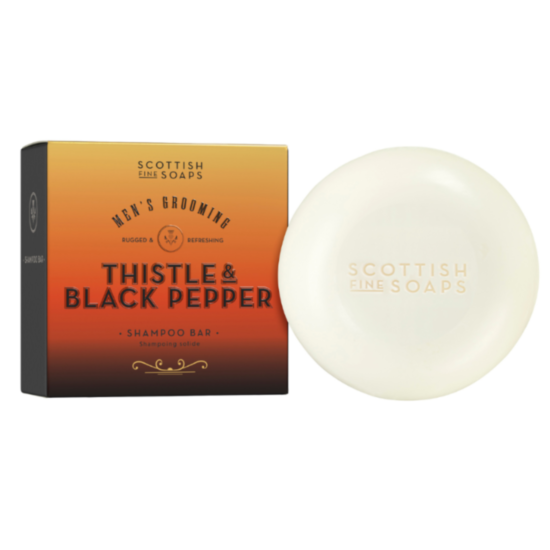 Шампоанът от серията Men's Grooming Thistle & Black Pepper притежава богат дървесен аромат, с нотки цитрусови плодове, кехлибар, билки и морски зърнастец. Подходящ е за честа употреба.