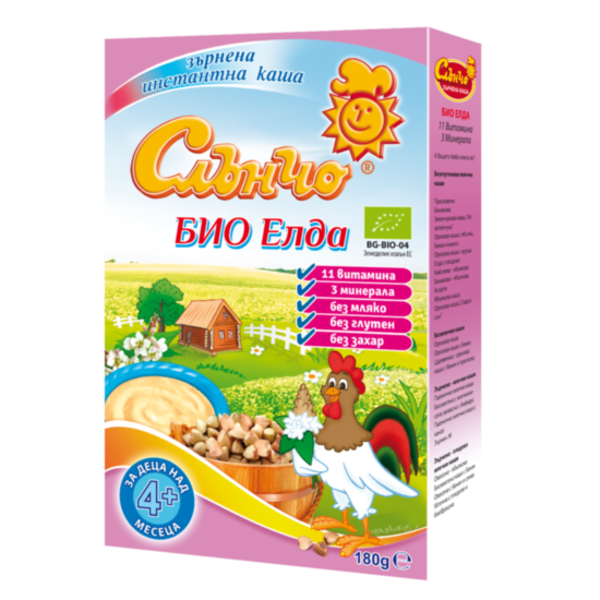 Слънчо Био безмлечна каша от био елда е засищаща храна с приятен вкус, предназначена за деца след 4 месеца. Тя съдържа важни витамини и минерали съобразено с възрастта и нуждите на детето. Безмлечната каша с елда на Слънчо обогатява менюто на децата с ценни хранителни елементи и осигурява балансирано и разнообразно хранене. Кашите "Слънчо" не съдържат оцветители, консерванти и ароматизанти. Съдържанието на сол се дължи изключително на наличието на естествено съдържащ се в храната натрий.
