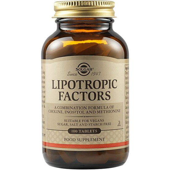 SOLGAR LIPOTROPIC FACTORS Солгар Липотропни Фактори. Хранителна добавка, съдържаща ефективна комбинация от холин, инозитол и метионин. Подкрепя здравето и правилното функциониране на черния дроб. Подпомага метаболизма на протеините и въглехидратите, спомага за отстраняването на мазнините от черния дроб и стимулира процеса на отслабване. Детоксикира и спомага за изхвърлянето на токсините от организма. Подходяща за вегани и вегетарианци. Не съдържа захар, сол, пшеница, мая, соя, глутен, млечни продукти, консерванти, изкуствени оцветители и овкусители.