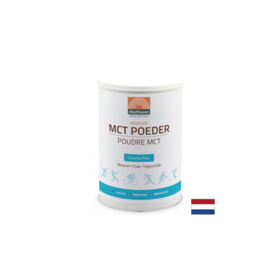 Absolute MCT Poeder - Coconut Pure 350g e хранителна добавка от MCT, Средноверижни триглицериди, на прах от кокосово масло. MCT е съкращението за средноверижни триглицериди (средноверижни мастни киселини). MCT мастните киселини се превръщат в енергия в тялото. Дълговерижните мастни киселини (от които тялото също се нуждае) се превръщат в енергия по-бавно от MCT мастните киселини. Кокосовото масло се използва за производството на MCT масло, тъй като кокосовото масло е най-богатият източник на MCT мастни киселини. MCT прахът се произвежда от MCT масло чрез процес, наречен сушене чрез разпръскване. Предимството на MCT на прах е, че лесно се смесва в смутита, топли напитки и рецепти за печене. MCT на прах има леко сладникав млечен вкус и е идеална алтернатива на млякото на прах в кафето, но и за да направите смутито си приятно и кремообразно. Този MCT прах е веган и следователно не съдържа лактоза. MCT мазнините се превръщат от тялото в молекули, наречени кетони. Тези кетони (и следователно мазнините, от които излизат) играят важна роля в кето диетата. Тези бързо усвоими мазнини също са полезни за спортистите като хранителни вещества по време на тренировка.