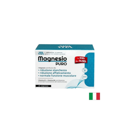 Sanavita Magnesio Puro е висококачествена хранителна добавка, разработена за подкрепа на сърдечно-съдовата и нервната система, както и за поддържане на нормалната функция на мускулите. Всяка опаковка съдържа 45 таблетки, които обогатяват дневната доза магнезий и витамини В1 и В6.
