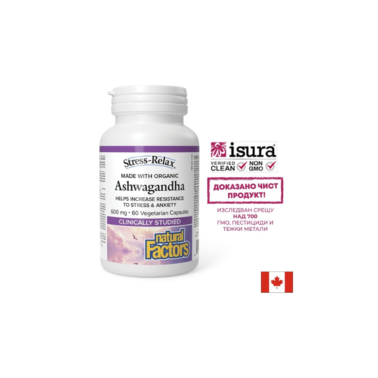 Stress-Relax Ashwagandha на канадската компания Natural Factors е естествен продукт, допринасящ за нормалното състояние на нервната, имунната и сърдечно-съдовата система.