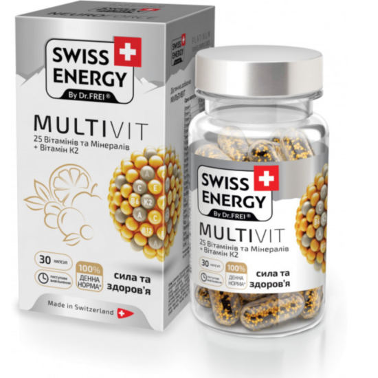 Подкрепя общото здраве на организма. Допринася за правилния енергиен метаболизъм и нормалната функция на имунната система. Витамин Е забавя процеса на стареене и спомага за красотата на косата и кожата. Витамини Б 1, Б 2, Б 6 и Б 12 подпомагат работата на нервната, ендокринната и храносмилателната система. Витамин К може да подобри калциевия метаболизъм и здравето на костите и сърдечно-съдовата система. Комбинацията от фолиева киселина, биотин, фосфор, йод, селен, калий, мед и хром влияе благоприятно върху редица органи и системи на тялото. Запълва дефицита на минерали и микроелементи на всички нива. Swiss Energy Multivit се препоръчва за хора с интензивна физическа активност, при случаи на хиповитаминоза и липса на минерални вещества.