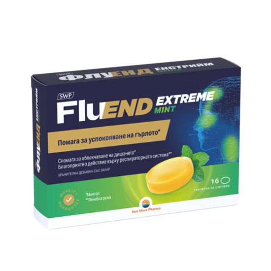 SUN WAVE PHARMA ФЛУЕНД МЕНТА ТАБЛ. Х 16 са таблетки за смучене, които съдържат екстракти от ментол, витамин С, бъз, евкалипт, лечебна ружа, полска мента и липа. Благодарение на състава си ФлуЕнд таблетки за смучене с мента облекчават състоянието на горните дихателни пътища и отпушват носа. Продуктът е подходящ при грипни състояния и хрема. Действа благоприятно при силни болки в гърлото. Използването на таблетките за смучене подпомага и нормалното функциониране на имунната система.
