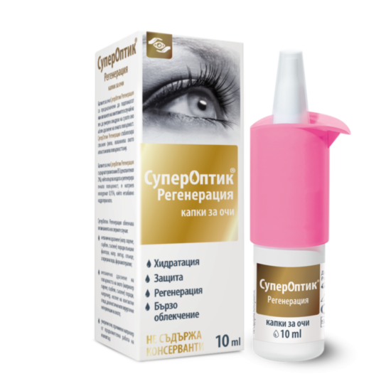 SuperOptic Regeneration са капки за очи с хидратиращ, успокояващ и защитен ефект, улесняващи регенерацията на очната повърхност. Повлияват симптоми в случай на лек до умерен синдром на сухото око и/или дразнене на очната повърхност. Действието им стабилизира слъзния филм, овлажнява окото и възстановява повърхността му при механично дразнене (напр. парене, сърбеж, сълзене) поради външни фактори, като вятър, слънце, хлорирана вода, фармакотерапия; вследствие носене на контактни лещи, диагностични или хирургични интервенции на окото; при уморени очи, причинени от продължителна работа на компютър. Супер Оптик имат двоен ефект: те съдържат натриев хиалуронат, който хидратира и стабилизира слъзния филм, и декспантенол, който успокоява, защитава и подпомага регенерирането на очната повърхност. Облекчаването на симптомите на синдром на сухото око може да предотврати усложнения.