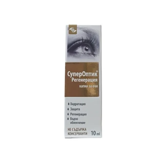 SuperOptic Regeneration са капки за очи с хидратиращ, успокояващ и защитен ефект, улесняващи регенерацията на очната повърхност. Повлияват симптоми в случай на лек до умерен синдром на сухото око и/или дразнене на очната повърхност. Действието им стабилизира слъзния филм, овлажнява окото и възстановява повърхността му при механично дразнене (напр. парене, сърбеж, сълзене) поради външни фактори, като вятър, слънце, хлорирана вода, фармакотерапия; вследствие носене на контактни лещи, диагностични или хирургични интервенции на окото; при уморени очи, причинени от продължителна работа на компютър. Супер Оптик имат двоен ефект: те съдържат натриев хиалуронат, който хидратира и стабилизира слъзния филм, и декспантенол, който успокоява, защитава и подпомага регенерирането на очната повърхност. Облекчаването на симптомите на синдром на сухото око може да предотврати усложнения.
