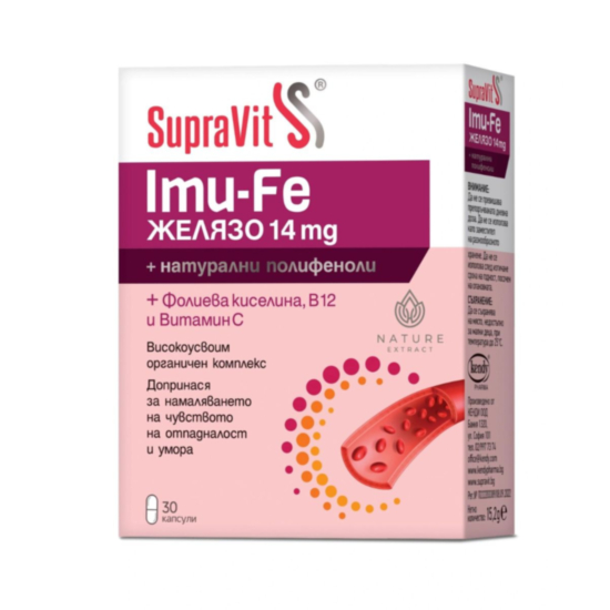 СУПРАВИТ ИМУ-ФЕ КАПС 14МГ Х 30 - Хранителната добавка Imu-Fe Желязо от SupraVit е комбинация от полифеноли, витамин В12 и С, фолиева киселина и антиоксидантния концентрат Oxxynea. Тя осигурява нормалния пренос на кислород и желязо в организма и се грижи за нормалното протичане на метаболизма. Освен това допринася за производството на енергия, спомага за нормалното кръвообразуване и намалява чувството за отпадналост и умора.