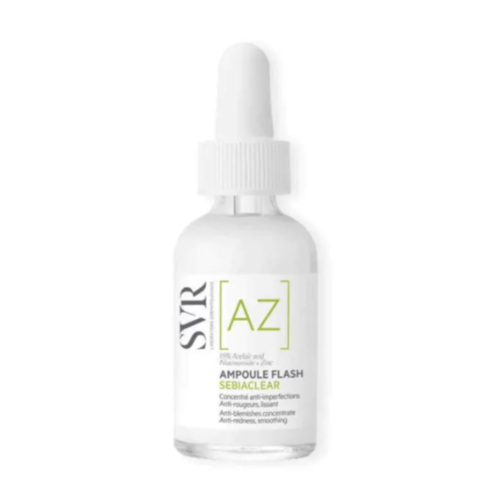 СВР СЕБИАКЛИЪР А3 АМПУЛА ФЛАШ 30МЛ е концентрат, изглаждащ неравенствата, белезите и петната, при смесена, мазна и склонна към акне кожа. Продуктът е подходящ за приложение над 10-годишна възраст. СВР Себиаклиър АЗ Концентрат за лице има доказана клинична ефективност при: мазна и склонна към акне кожа, разширени пори, дехидратирана кожа вследствие на изсушаващи процедури, несъвършенства, белези, бръчки и зачервявания. Формула обогатена с 15% Азелаинова киселина с противовъзпалително, антибактериално и себорегулиращо действие. Стимулира процеса на ексфолиране и клетъчна регенерация. 2% Цинк - придава гладка текстура на кожата. 2% Ниацинамид - успокоява и овлажнява. SEBIACLEAR Ampoule flash дълбоко почиства, видимо намалява несъвършенствата и зачервяванията за рекордно кратко време. Неговата млечна и лека текстура се слива с кожата за незабележим завършек. Без парабени. Дерматологично тестван продукт. Некомедогенен.