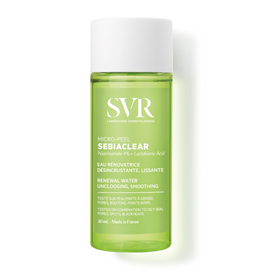 Микропилинг водата за лице Sebiaclear отпушва порите и изглажда кожата, като я успокоява, хидратира и придава усещане за свежест. Специалната формула съдържа две допълващи се кератолитични киселини с бързо и трайно действие върху порите, петната и черните точки. Тя се състои от 90% съставки от естествен произход. Леката текстура прониква в кожата и попива бързо, като предлага сух завършек, без лепнещо и мазно усещане. Продуктът е дерматологично тестван и е подходящ за чувствителна, комбинирана и мазна кожа, склонна към акне.