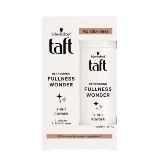 ТАФТ ПУДРА ЗА ОБЕМ МИГНОВЕНА СВЕЖЕСТ 10ГР. е пудра за коса за моментален и максимален обем. Тя намалява омазняването и придава свеж вид на прическата. Пудрата е специално създадена така, че да повдигне прическата от корените, структурирайки всеки кичур. Не утежнява косата, не оставя следи и лепкаво усещане. Отличава се още със своята формула, съдържаща 99% съставки с натурален произход. За всеки тип коса.