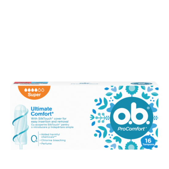 ТАМПОНИ О.В. ПРОКОМФОРТ СУПЕР X 16 са предназначени за средно до силно течение. Тампоните О.Б. ПроКомфорт се отличават с уникално копринено меко SilkТouch покритие за лесно поставяне и изваждане на тампона, доставяйки максимален комфорт и надеждна защита чрез революционната технология DynamicFit™ с 3D разширяване, която се адаптира към тялото след поставяне и помага за ефикасно разпределяне на течността в тампона чрез взаимно свързани каналчета. Те се предлагат във варианти с различни абсорбиращи свойства, за да отговорят на конкретните нужди от защита в зависимост от силата на течението.
