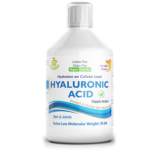 Swedish Nutra Хиалуронова киселина 100 мг - подхранване на клетъчно ниво. Едва 7000 далтона молекулно тегло, за максимално усвояване. Хиалуроновата киселина присъства във всяка тъкан от тялото ни. Най-силна концентрация е съсредоточена в съединителната тъкан, кожните клетки и ставния хрущял. Тя е съставна част на синовиалната течност (ставна течност), където служи за "смазка" между ставите, за да облекчи триенето помежду им. Хиалуроновата киселина се среща още в клапите на сърцето, стъкловидното тяло на окото, съединителната, епителна и нервна тъкан. Нашата формула включва, Хиалуронова киселина 100 мг, Витамин С 80 мг и Силика 15 мг. Течната хиалуронова киселина на Swedish Nutra е преработена в много ниско молекулно тегло едва 7000 далтона и се усвоява на 100% от организма!