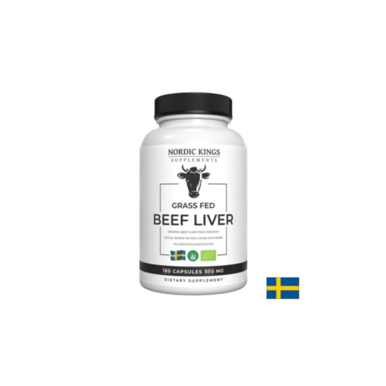 Beef Liver (grass fed) - Телешки черен дроб е 100% органична хранителна добавка под формата на капсули, добита от черния дроб на KRAV сертифицирани телета, хранени изцяло с трева и билки. Този продукт не съдържа антибиотици, пестициди и хормони на растежа, а телешкия дроб е изсушен чрез замразяване и по този начин се запазват всички ценни хранителни вещества. Той е богат на витамини, минерали и ценни ензими, подпомага имунната система и спомага за подобряване на метаболизма на хранителните вещества. Освен това допринася за нормалното образуване на червени кръвни клетки и поддържа нормалните нива на хемоглобин в кръвта. Спомага за увеличаване притока на кислород в тялото, както и достигането му до всяка една клета. Допринася за поддържане на здрава кожа, коса и нокти и подкрепя здравето на сърцето и сърдечно-съдовата система.