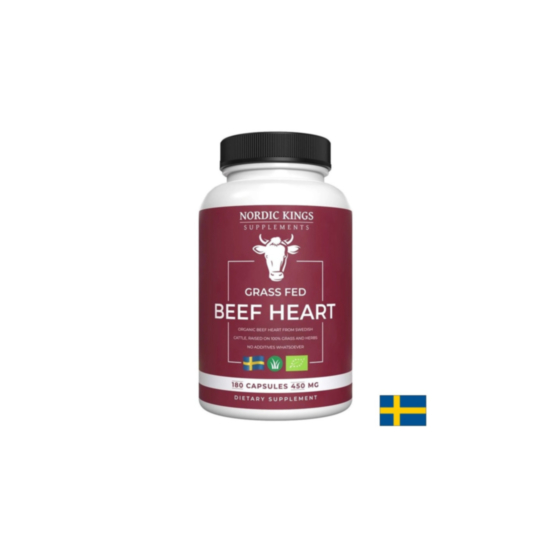 Beef Heart (grass fed) - Телешко сърце е хранителна добавка под формата на капсули, добита от 100% органични телешки сърца от хранени изцяло с трева и билки телета. Съдържа комбинация от витамини, минерали, както и високи дози от антиоксиданта коензим Q10. Тази хранителна добавка допринася за нормалното състояние на сърдечно-съдовата система, както и за нормалното образуване на червени кръвни клетки и колаген в организма. Благодарение на високото съдържание на желязо в състава си, телешкото сърце спомага за образуването на червени кръвни телца, както и транспортирането на кислород до всяка клетка в тялото. Освен това тази хранителна добавка съдържа витамини от групата B, които допринасят за здравето на нервна система и подпомагат нормалния метаболизъм. Има и оптимални дози витамин C, който подкрепя имунната система. Телешкото сърце съдържа и много високи количества от антиоксидантна коензим Q10, който подобрява работата на сърцето, спомага за елиминирането на токсините от организма и ускорява синтеза на колаген в тялото. Тази хранителна добавка не съдържа пестициди, антибиотици и хормони на растежа.