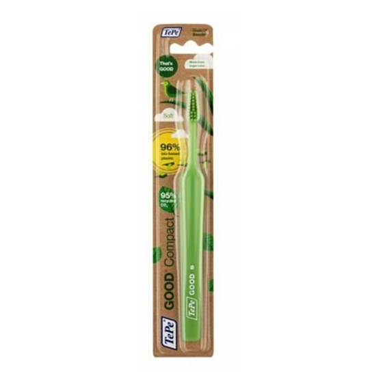 ТЕПЕ ЧЕТКА ЗА ЗЪБИ ГУУД КОМПАКТ СОФТ A е висококачествена четка за зъби за възрастни, която е изработена на 96% от биоразградима пластмаса и осигурява максимално почистване, свежест и комфорт в устната кухина. Нейните фиксирани влакънца на главата ѝ позволяват да достигнете безпроблемно дори и до най-труднодостъпните междузъбни пространства и да елиминирате натрупалите се замърсявания, плака и остатъци от храна, само с няколко лесни стъпки.