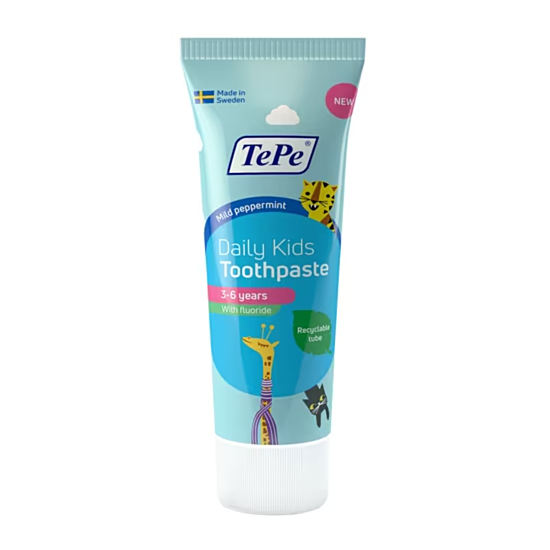 TePe е нежна ежедневна детска паста за зъби с флуорид, която помага за предотвратяване на кариес. Пастата за зъби е направена с малко и внимателно подбрани съставки в сътрудничество с дентални експерти, специално за деца на възраст от 3 до 6 години. Това е детска паста за зъби с лек вкус на мента без лаурил сулфат и без пяна, така че родителите лесно да виждат зъбите по време на миене. Съдържа ниво на флуорид от 1000 ppm, което е подходящо за тази възраст. Не се пенообразува. Веган, без SLS.