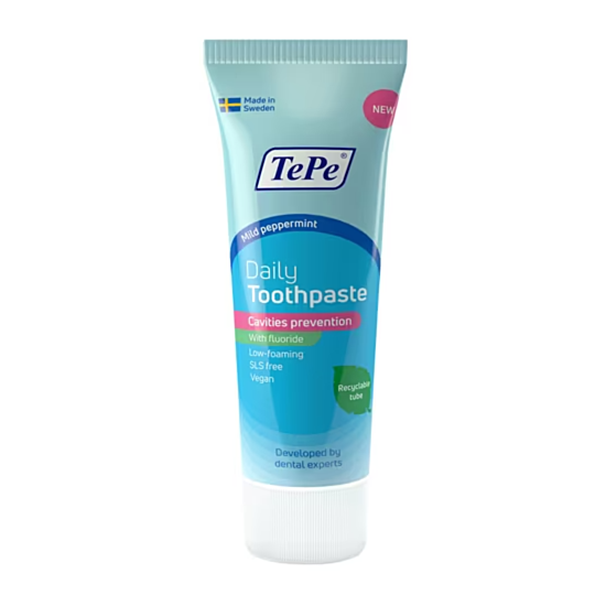 TePe е нежна ежедневна паста за зъби с флуорид, която помага за предотвратяване на кариес. Направена от внимателно подбрани съставки, които са разработени в сътрудничество с дентални специалисти.
