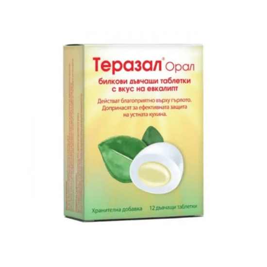 ТЕРАЗАЛ ЕВКАЛИПТ ДЪВЧ. ТАБЛ. Х 12 са подходящи при проблеми с лигавицата на устата, раздарзнения, афти. Те намаляват дразненето и стимулират процеса на регенерацията на лигавицата. Помагат за защита на устната кухина, облекчават болки в гърлото и са подходящи за възрастни. Добавения в таблетките витамин С подпомага за по-силен имунитет. Има общ позитивен ефект върху зъбите и венците.