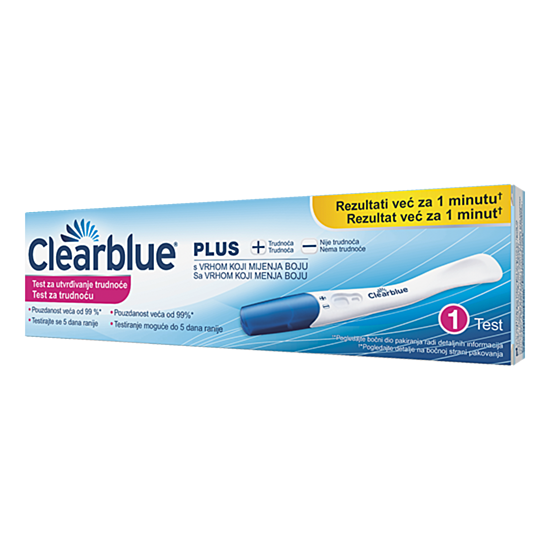 Clearblue Plus е лесен за употреба тест за бременност, който отчита положителен резултат само след 1 минута. Точността му е над 99% от първия ден на закъснение на менструацията. Неговият ергономичен дизайн го прави изключително лесен за употреба, а заради дългата си извита дръжка е в пъти по-хигиеничен. Абсорбиращият връх е 50% по-широк, което улеснява взимането на пробата. Промяната на цвета от бял на розов показва, че тестът е поел достатъчно количество урина, за да отчете правилен резултат.