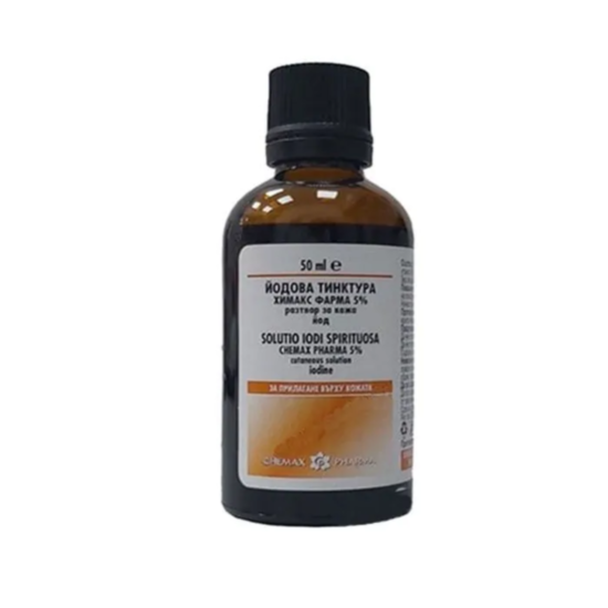 Тинктура йод разтвор 5% 50 мл Chemax Pharma е антисептично средство, което има дезинфекциращо, бактерицидно и кръвоспиращо действие. Тинктура йод разтвор 5% 50 мл Химакс Фарма се използва за дезинфекция и обработка на кожата, за туширане на рани или около тях, на повърхностни рани с неправилна гранулация, при фистули и язви, при актиномикоза, ботриомикоза, както и при трихофития и други дерматомикози. Предлага се в опаковка от 50 мл.