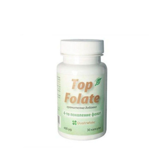 Топ Фолат капсули представлява хранителна добавка с фолат, който има благотворен ефект върху здравето на сърдечно-съдовата система и подпомага нормалното функциониране на нервната система. Фолатът участва в синтеза на невротрансмитери и в критични ензимни реакции в целия организъм. Топ Фолат поддържа здравето на сърдечно-съдовата система, като изчерпва излишния хомоцистеин. Този биоактивен фолат притежава до седем пъти по-голяма бионаличност от фолиевата киселина, което помага много при хора с генетичесн дефицит на метаболизиращи фолиева киселина ензими, както и при бременни жени.